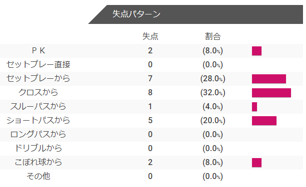 名古屋の失点パターンの30%超がセットプレーからの失点です。