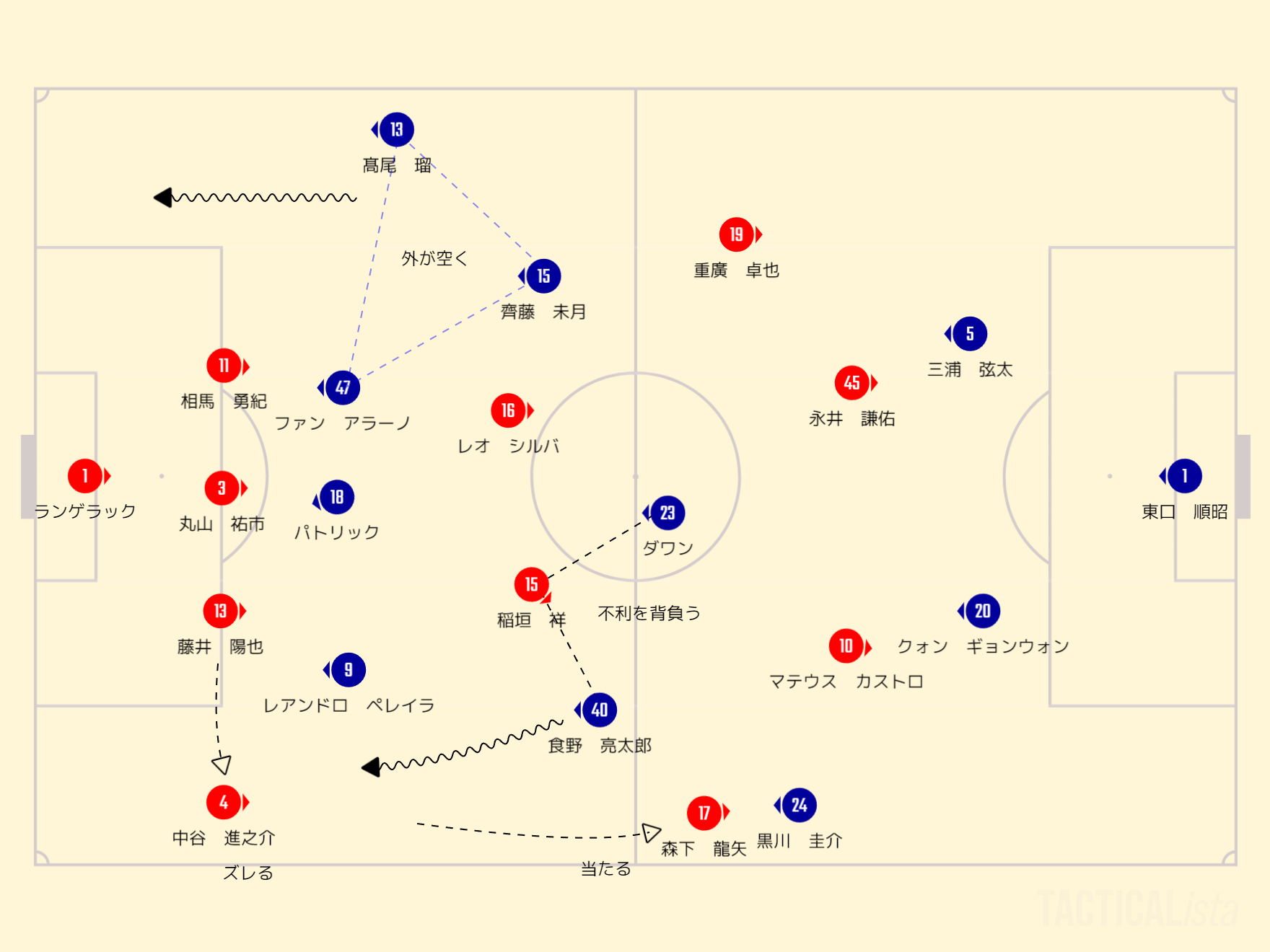 中谷が対応したボールはアラーノの元へ、アラーノがボールを綺麗に足元へ納めたので、藤井は中谷が釣り出された状況で縦に仕掛けられると中が厳しくなると判断してかなり早い段階で縦への侵入を防ぐために身体を外側へ開く。それを見れば当然レオは藤井が身体を外側に開いた分出来てしまうペレイラへのパスコースを消す為にパトリック側へは流れる事が出来ない。それと同時に食野へのパスコースも稲垣が消してくれていなかった為、より一層パトリック側へ寄る事は出来ない。