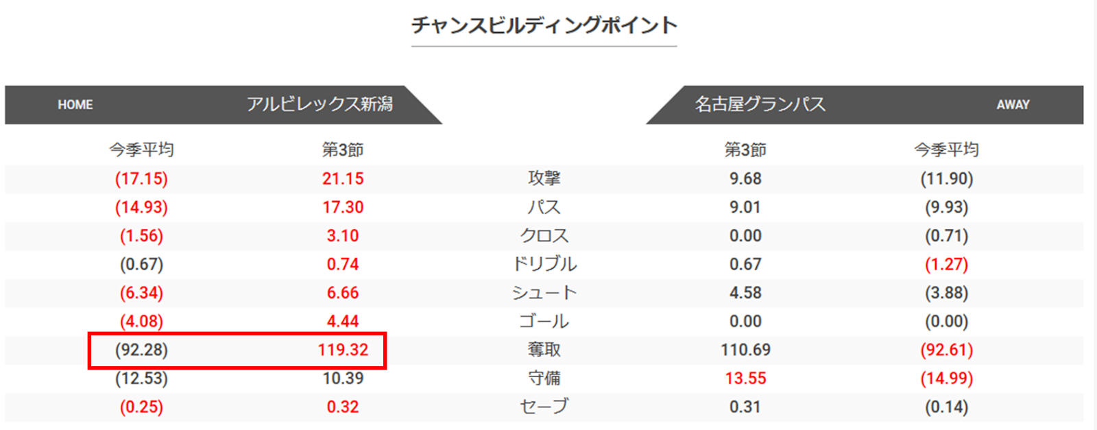 今節CBP奪取ポイントを見ても新潟は今季平均より大幅な奪取ポイントを獲得しており、名古屋から見て低い位置でボールを奪い返されていた事を示唆しています。