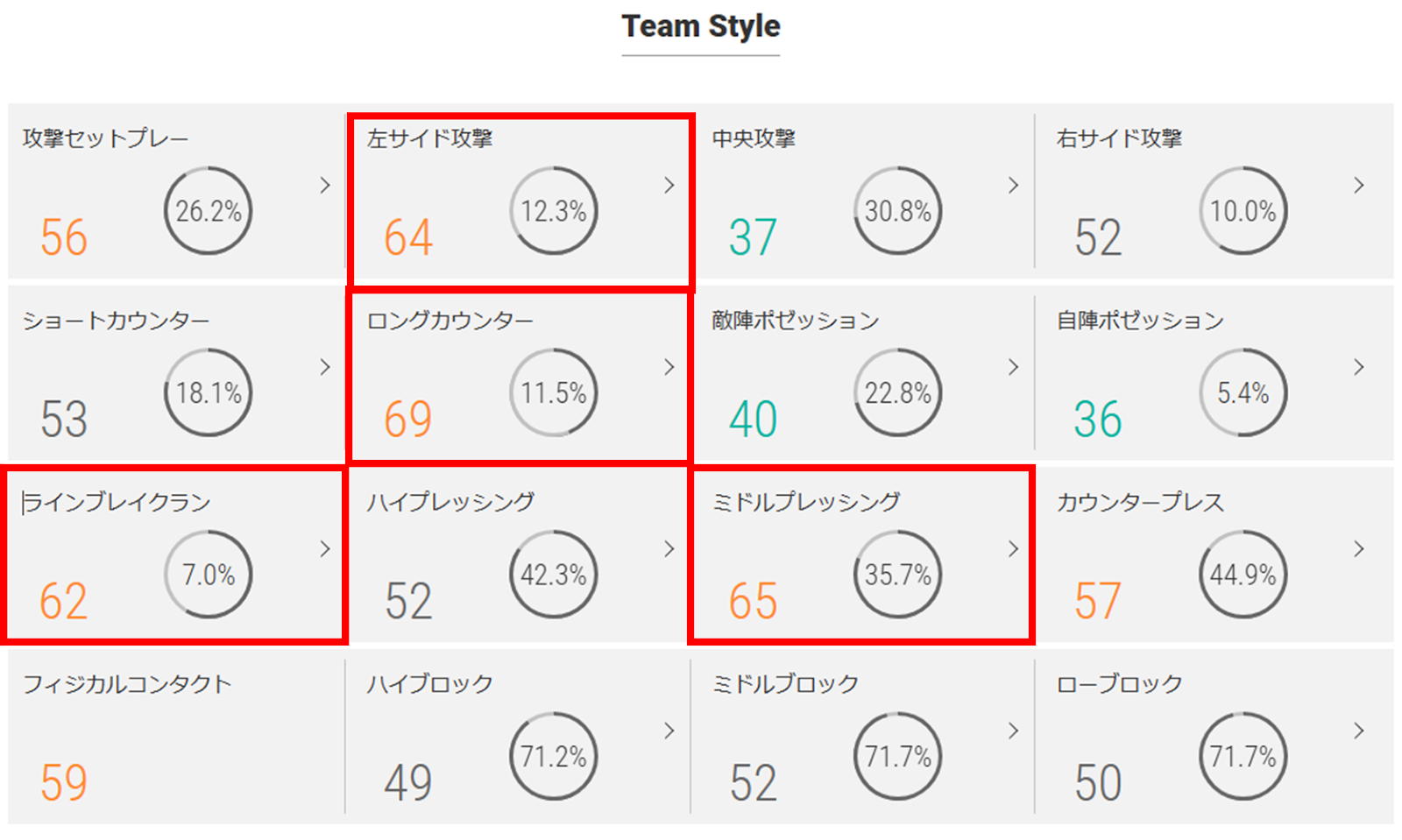 Team Styleをみると、サイド攻撃を主体にしつつ、ミドルプレッシングからのロングカウンターや裏抜けなど、シンプルかつ明確にゴール前に迫ってきます。シュート数やチャンス構築率はさほど高くないもののシュート成功率は12.4%(リーグ2位)と少ないチャンスを確実にものにしてくる攻撃は脅威です。