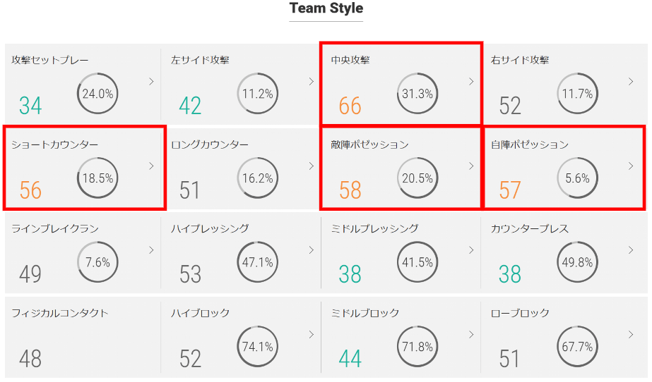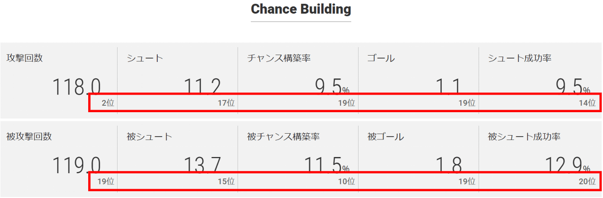 ChanceBuildingデータではチャンス構築率、シュート成功率は低めとなっており、ボールをもって攻め込まれても焦ることなく守ることで、勝機を見出せるかもしれません。被ゴール、被シュート成功率の値も低く、逆に攻撃時は積極的にシュートを撃つ姿勢でゴールを目指していくのがよさそうです。