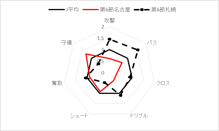 第34節北海道コンサドーレ札幌戦のプレビューです。名古屋と札幌のデータ(シーズン平均)をプロットします。
