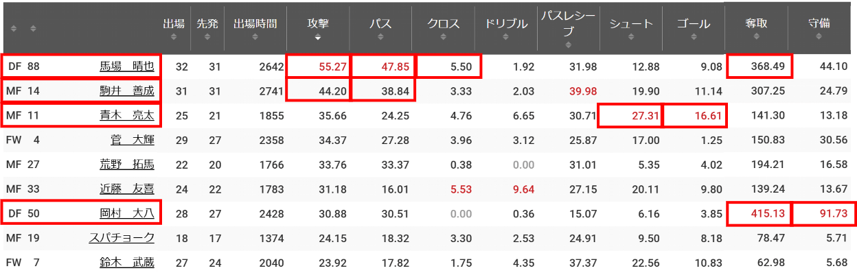 守備面を見てみます。全体1位は菊地。中盤で守りの面でも頑張ってくれました。チーム2位はハチャンレ。ウェリントンには少し苦しんでいる様にみえましたが、ザヘディはしっかりと抑えてくれたと思います。