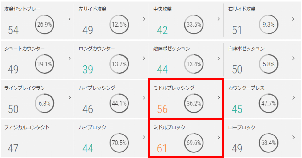 Team Styleを見てみると意外と地味(表現)。強いて言うならミドルプレッシング、ミドルブロックの値が高く、堅実かついい位置で守備ができているといった感じでしょうか。