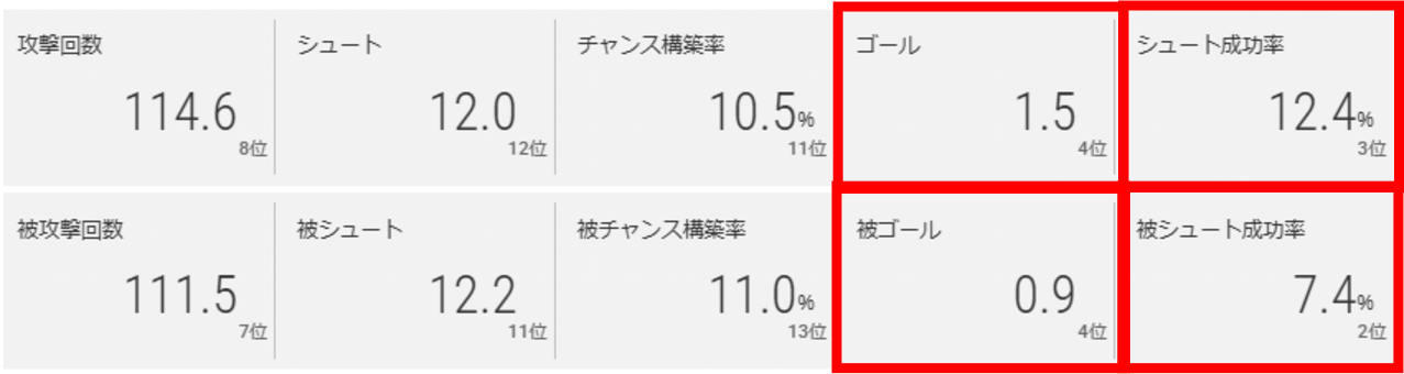 グラフはバランスよしでほぼリーグ平均位です。やや大きいのがシュートですが。やっぱり上位に行くにはしっかりシュートを枠に飛ばすのが大事なんですねぇ…。