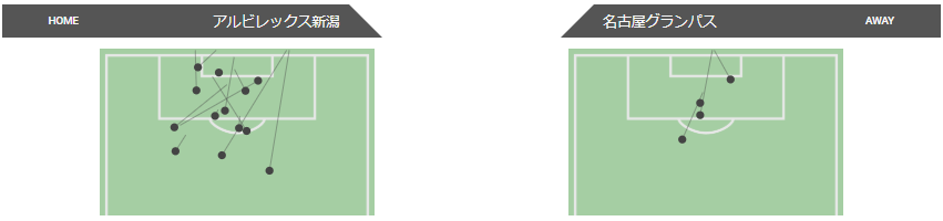 グラフは…まぁええか…というわけにもいかないので触れますが試合を観た感想の通り、新潟攻撃系グラフがデカく攻め込まれながらも必死で守りきって守備がデカい名古屋といった感じですかね。ある意味計画通りなのですが、もうちょっと攻めるタイミングも持ちたかったですね。